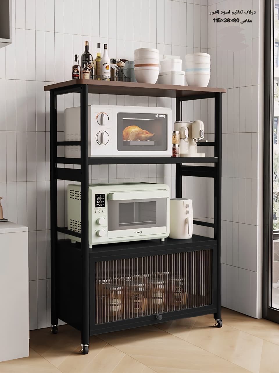 - تصميم مكون من 4 أرفف عملية لتخزين أدوات المطبخ، المواد الغذائية، الأواني، أو حتى الأجهزة الصغيرة.
