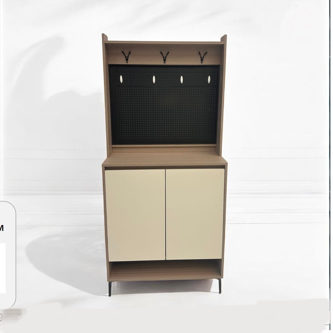 دولاب ركن قهوة متعدد الاستخدامات يجمع بين الجودة العالية والتصميم العملي، مصنوع من خشب متين بلون بيج فاتح ممزوج باللون الخشبي الدافئ. يتميز الجزء العلوي بخلفية سوداء مثقبة وثلاثة علاقات معدنية سوداء وأربعة علاقات بيضاء، بينما يوفر الجزء السفلي بابي تخزين عمليين ورفًا مفتوحًا. هذه القطعة الأنيقة توفر مساحة تخزين وتنظيم مثالية لأدوات القهوة والمستلزمات الأخرى، مما يجعلها إضافة مثالية لأي منزل عصري."