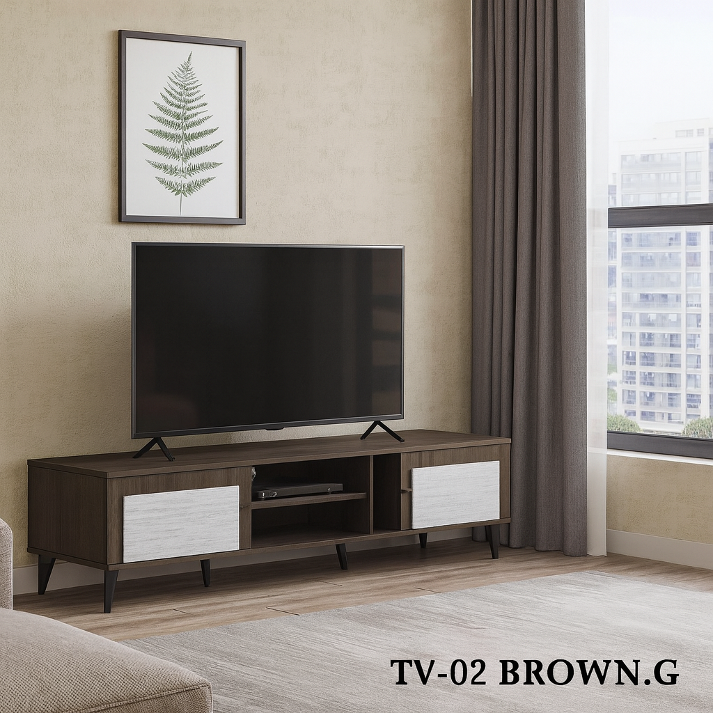 تتميز هذه الطاولات بتصميم عصري وأنيق، يجمع بين الجمال والوظيفة. إنها حل مثالي لتنظيم مساحة التلفزيون بفضل الأرفف المفتوحة والخزائن المغلقة التي توفر مساحة تخزين واسعة لأجهزتك وملحقاتها. وتأتي الطاولة بلونين مختلفين، أحدهما يدمج اللون الخشبي الفاتح مع الأسود، والآخر يدمج اللون الخشبي الغامق مع الأبيض، لتناسب ديكوراتك المتنوعة وتضيف لمسة جمالية إلى أي غرفة.