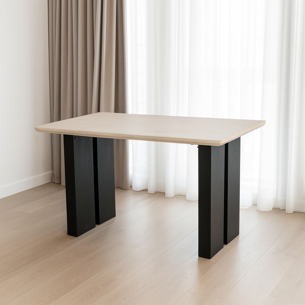 طاولة طعام بتصميم عصري أنيق، تجمع بين سطح بلون خشبي فاتح وقاعدة مستقرة بأرجل خشبية أو سوداء تناسب مختلف الديكورات.