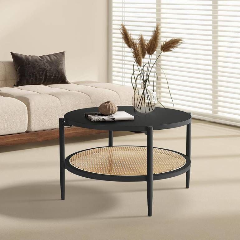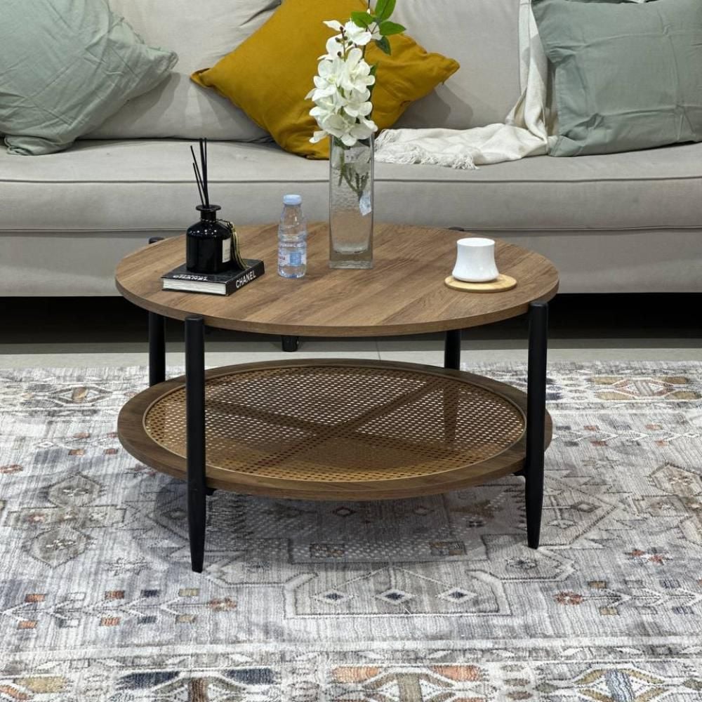 طاولة دائرية مفردة رئيسية تأتي بسطح باللون الأسود وبرف من اللون البني وبقواعد من الحديد المطلي باللون الأسود