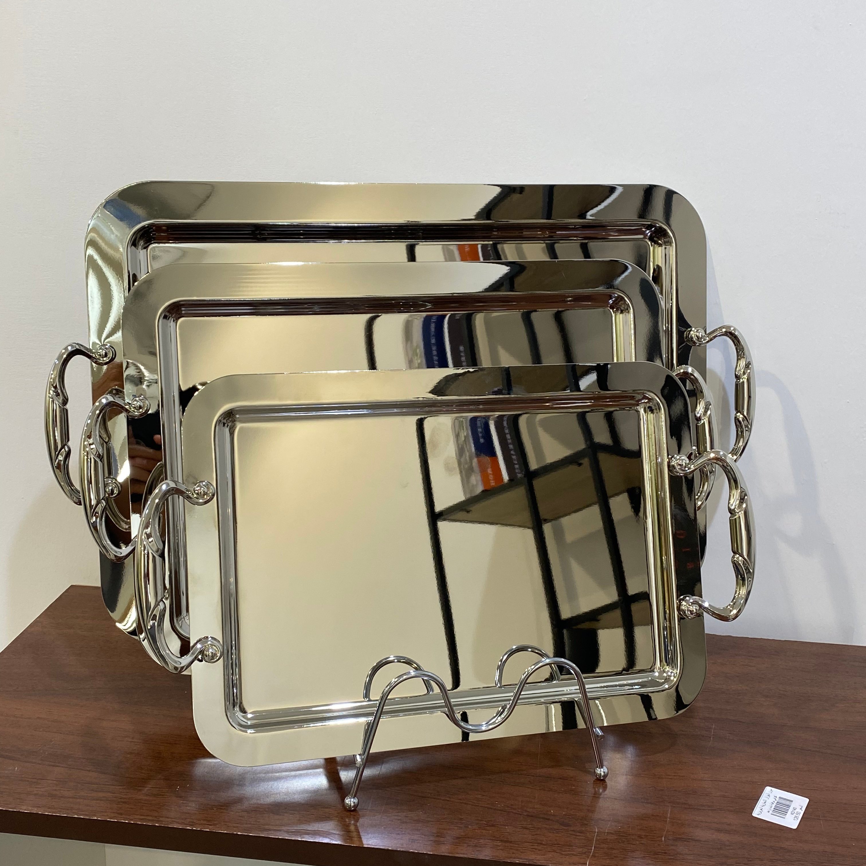 طقم صواني تقديم مستطيلة الشكل مصنوعة من معدن فضي لامع، تبدو وكأنها ستانلس ستيل أو فضة، مما يمنحها مظهراً أنيقاً وعصرياً. تتميز الصواني بثلاثة أحجام مختلفة موضوعة داخل بعضها البعض بشكل مرتب، وكل صينية مزودة بمقبضين جانبيين بتصميم منحني وأنيق لسهولة الحمل. الطقم يجمع بين المتانة والجمال، وهو مثالي للتقديم في المناسبات بفضل جودته