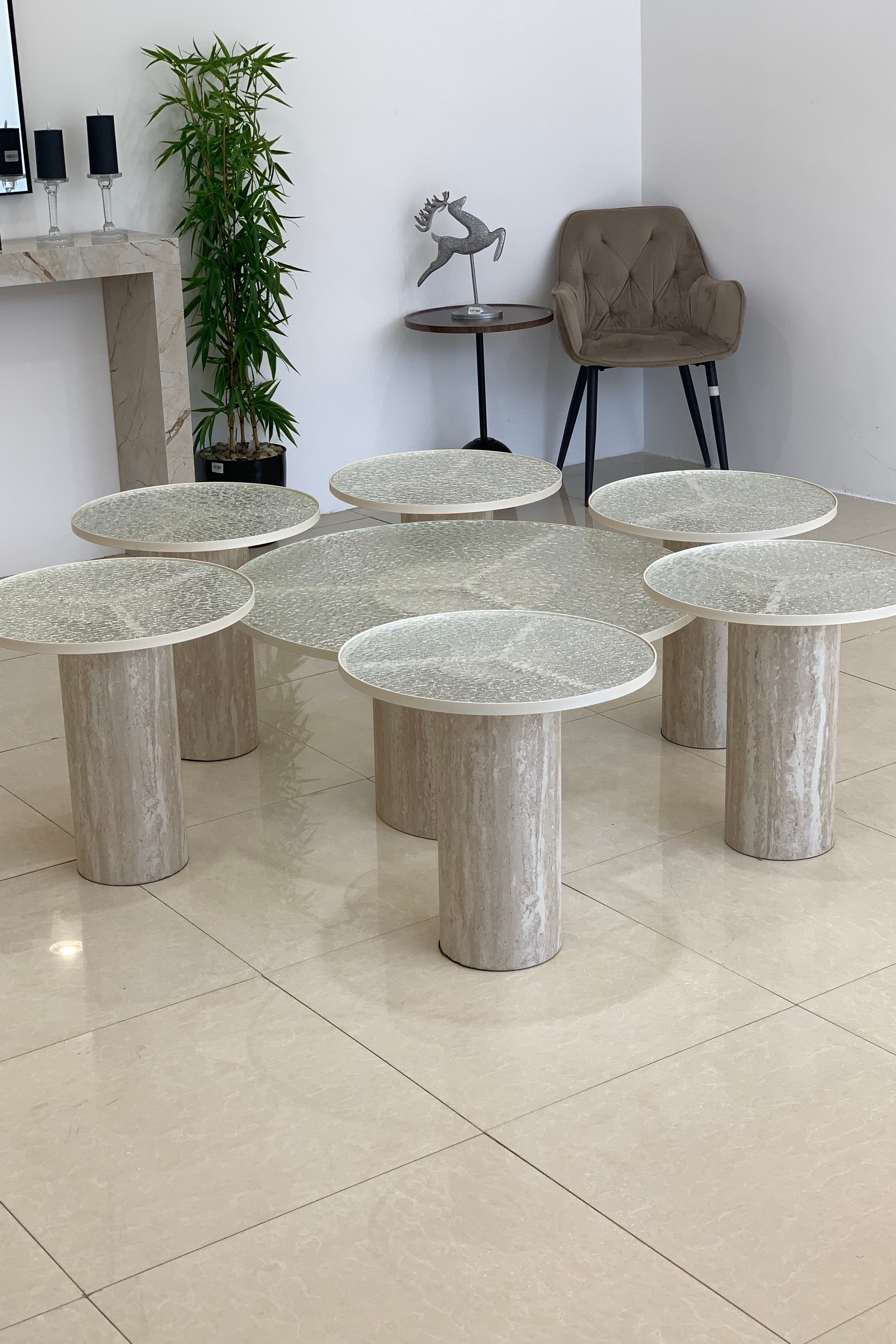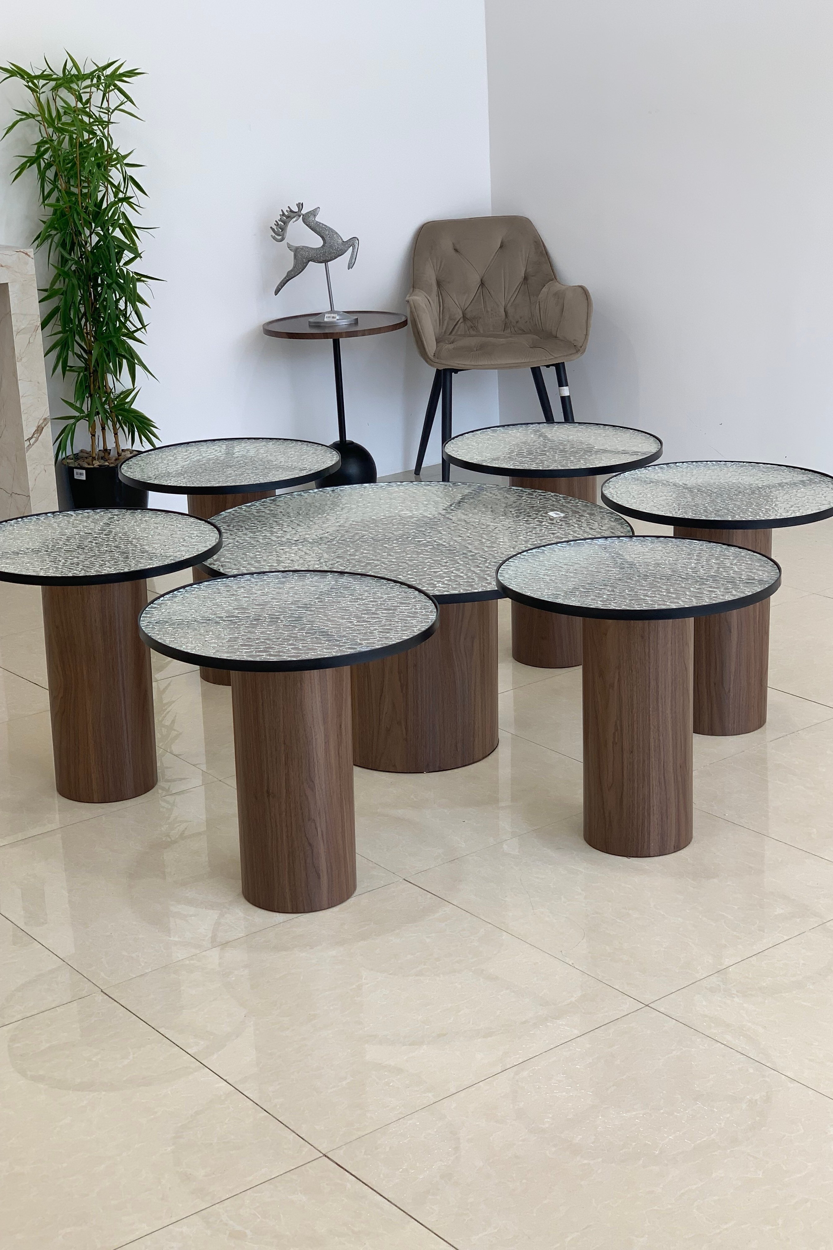 تُظهر الصور طقمين متشابهين من الطاولات الدائرية بتصميم عصري. تتكون هذه الأطقم من طاولة مركزية كبيرة وست طاولات جانبية أصغر، جميعها مصنوعة بقاعدة أسطوانية وتوب زجاجي. الطقم الأول يتميز بقواعد من الرخام الأبيض أو مادة شبيهة بالرخام مع عروق طبيعية، بينما الطقم الثاني له نفس التصميم ولكن بقواعد من الخشب الداكن أو مادة تشبه الخشب بلون بني غامق. تتميز هذه الطاولات بمرونتها في الاستخدام كطاولة قهوة مركزية ومساند جانبية عملية، وتوفر مظهرًا أنيقًا ومميزًا للمساحة.
