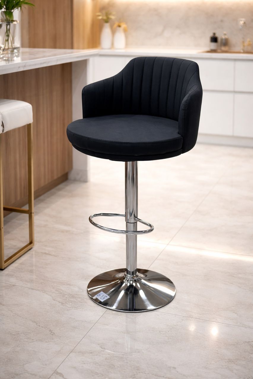 كرسي بار أنيق وفاخر، يجمع بين التصميم الكلاسيكي والوظائف العصرية، مثالي لإضفاء لمسة من الرقي على المطابخ المفتوحة أو كاونترات المقاهي. يتميز بمقعد مبطن ومغطى بجلد أسود فاخر