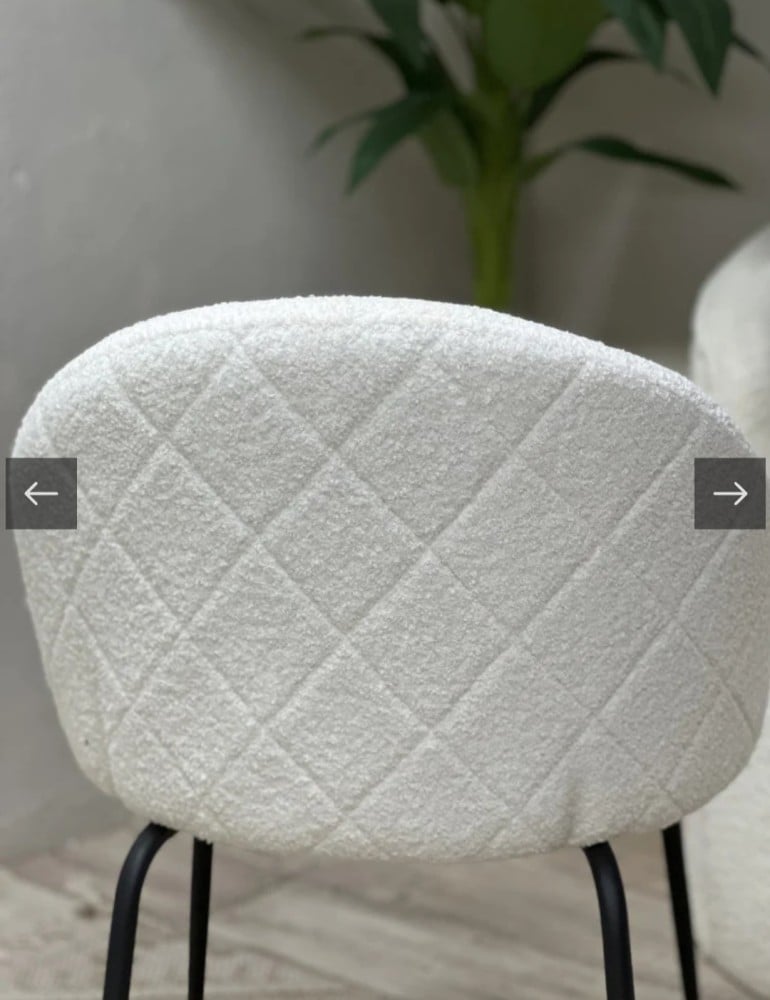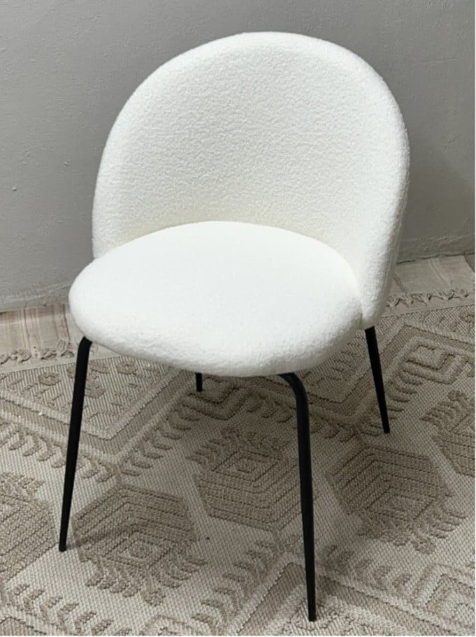 هذا الكرسي مصنوع من قماش البوكليه الناعم باللون الأبيض العاجي، ويتميز بتصميم عصري وأنيق مع مسند ظهر دائري ومقعد مبطن لتوفير الراحة. أرجل الكرسي رفيعة ومصنوعة من المعدن الأسود، مما يضيف لمسة من الأناقة والثبات. يتميز بخفة وزنه وسهولة تحريكه، مما يجعله قطعة مثالية لتأثيث مختلف المساحات بلمسة عصرية ومريحة.