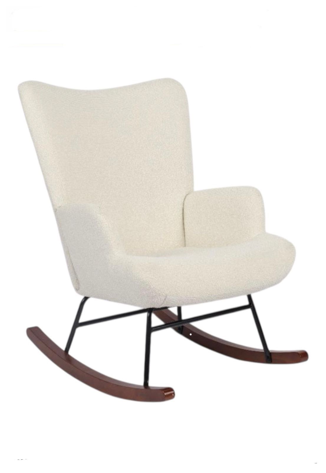 هذا الكرسي الهزاز هو الإضافة المثالية لأي مساحة معيشة، حيث يجمع بين التصميم المعاصر والراحة الفائقة. يتميز الكرسي بتنجيد فاخر من قماش البوكليه الذي يمنحه ملمسًا ناعمًا وشعورًا بالدفء، مع مسند ظهر مرتفع يوفر دعمًا ممتازًا للرأس والرقبة