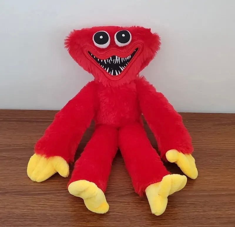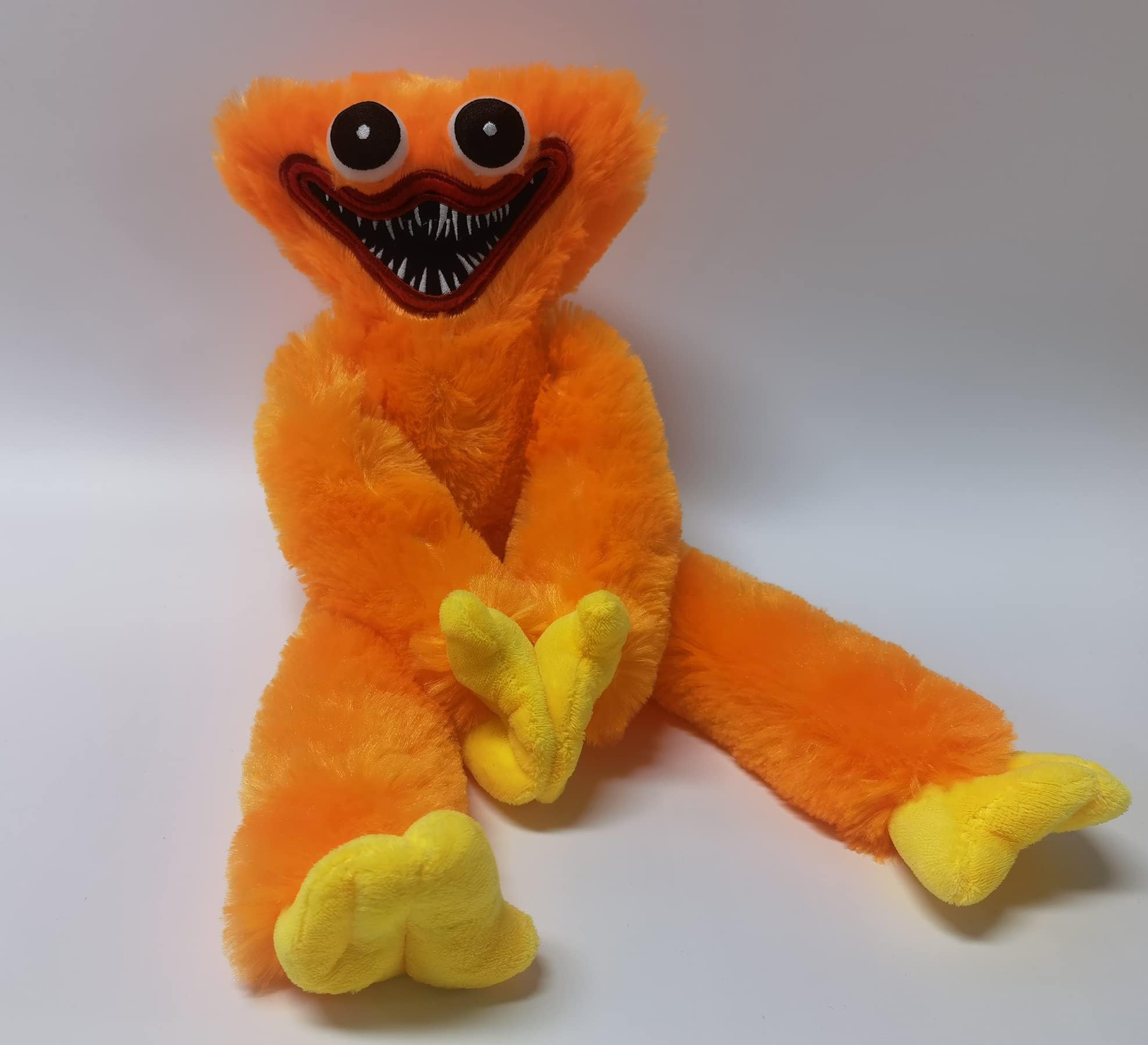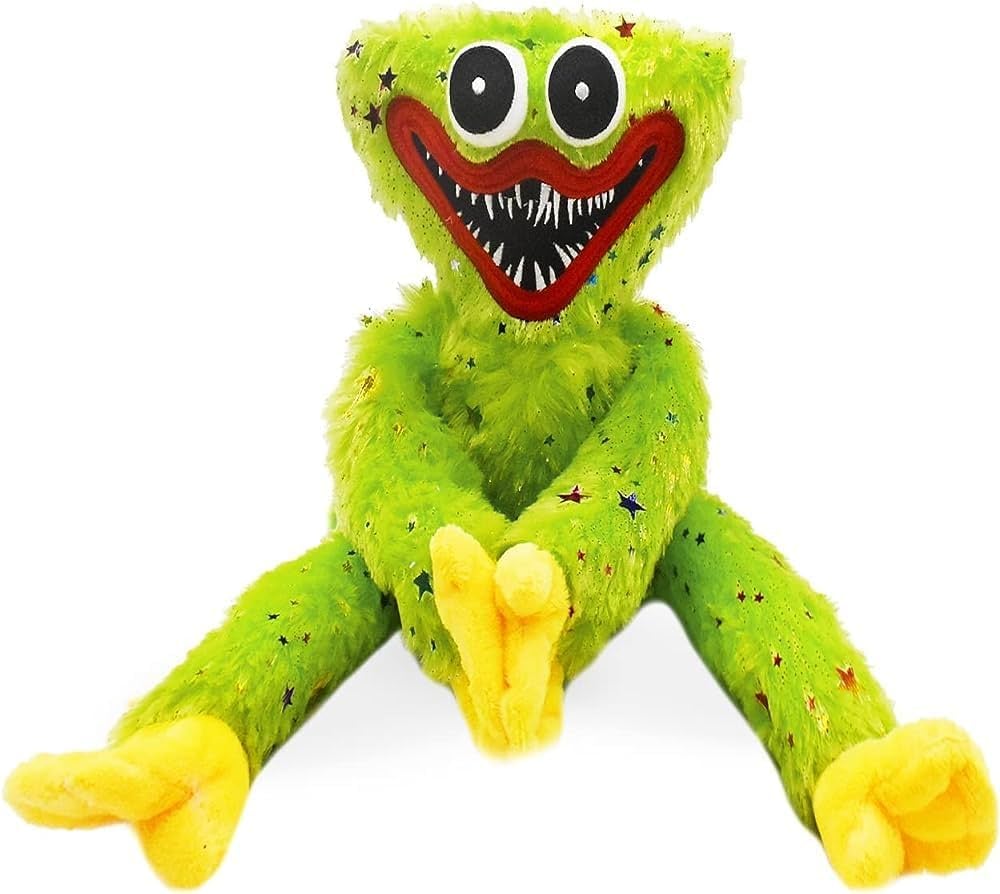 هذه الدمية هيجي وجي (Huggy Wuggy) تتميز باللون الأخضر الليموني الفاتح والاحمر والبرتقالي وهي مغطاة بنقوش نجوم صغيرة متعددة الألوان. لها فم واسع أحمر اللون مع صفين من الأسنان البيضاء الحادة المدببة. عيناها كبيرتان ومستديرتان، باللونين الأبيض والأسود. يديها وقدميها صفراء اللون، ويبدو أنها مصنوعة من مادة ناعمة وفروية. الدمية في وضعية جلوس بأطراف ممدودة.