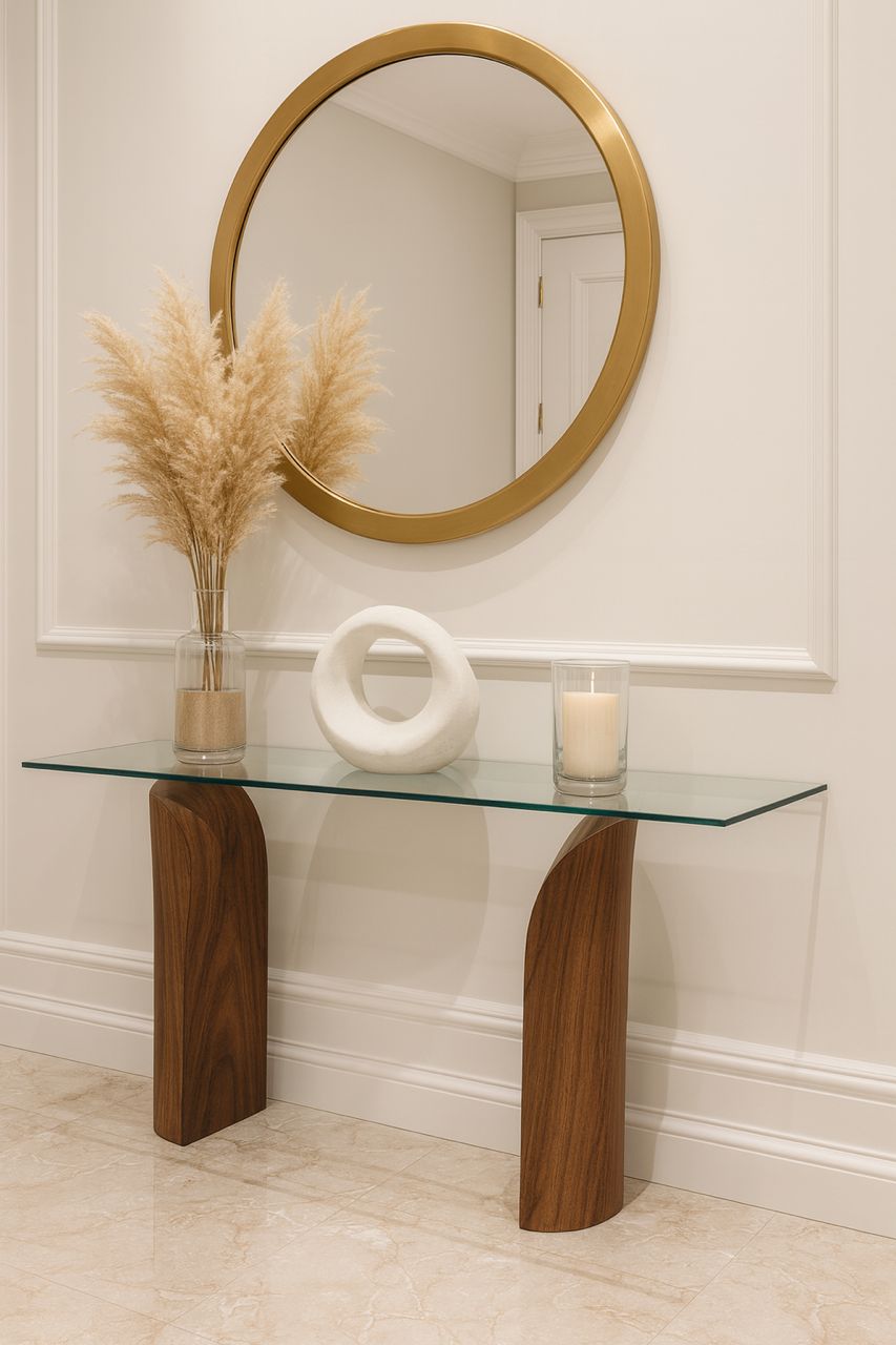 مدخل كونسول أنيق بسطح زجاجي يعكس لمسة فخامة، يأتي بتصميم مودرن يتوفر بعدة أشكال وألوان تناسب مختلف أنماط الديكور. مثالي لتزيين مداخل المنازل أو استخدامه كقطعة ديكور عملية في المجالس والممرات.