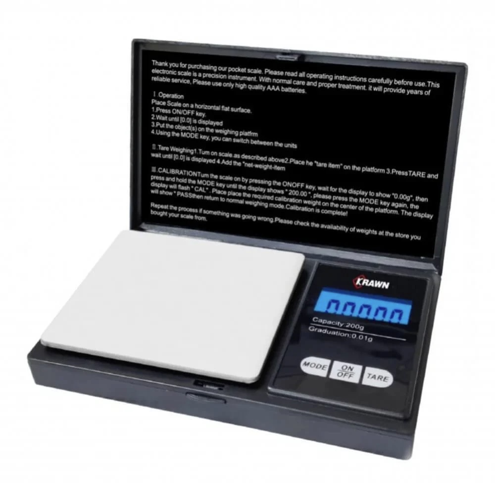 تظهر الصورة مقياس جيب رقمي Krawn KW-46010، المعروف أيضا باسم مقياس المجوهرات، وهو مصمم لقياسات دقيقة للعناصر الصغيرة مثل الذهب والمجوهرات والمكونات الغذائية.